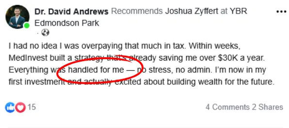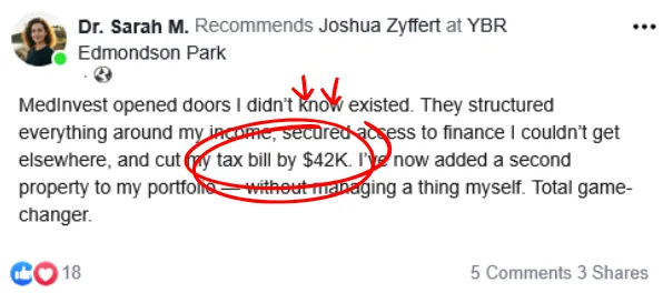 Within the first 90 days, he saved $43,700 in tax, improved his borrowing capacity, and secured a high-performing asset that is now generating passive income — all without lifting a finger or losing time from his practice.